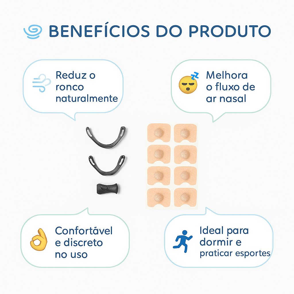 Com design leve e confortável, ele ajuda a abrir suavemente as vias nasais, reduzindo o ronco e facilitando a passagem de ar seja durante o sono ou prática esportiva.